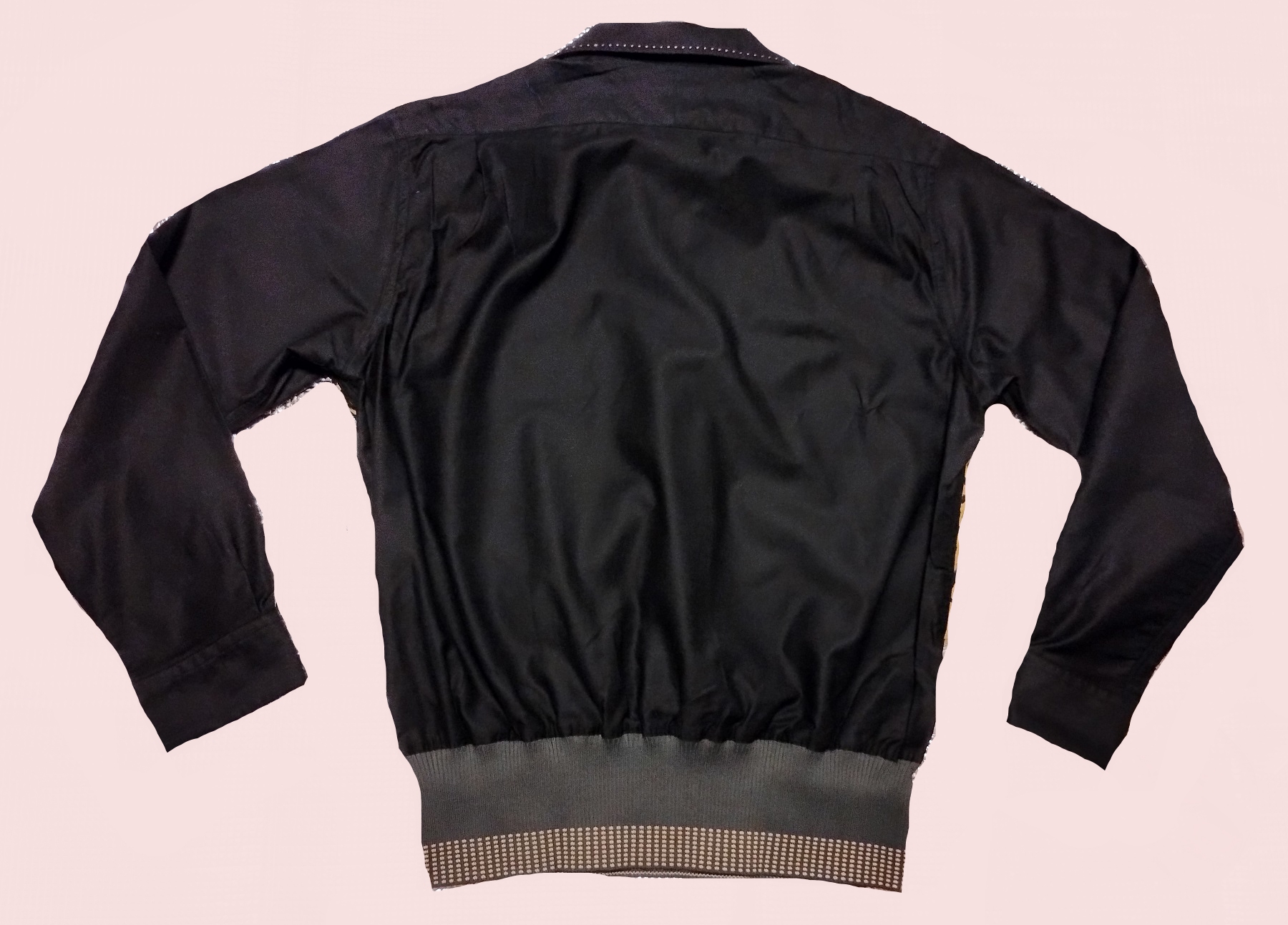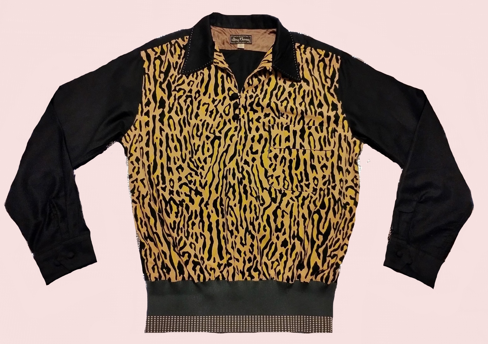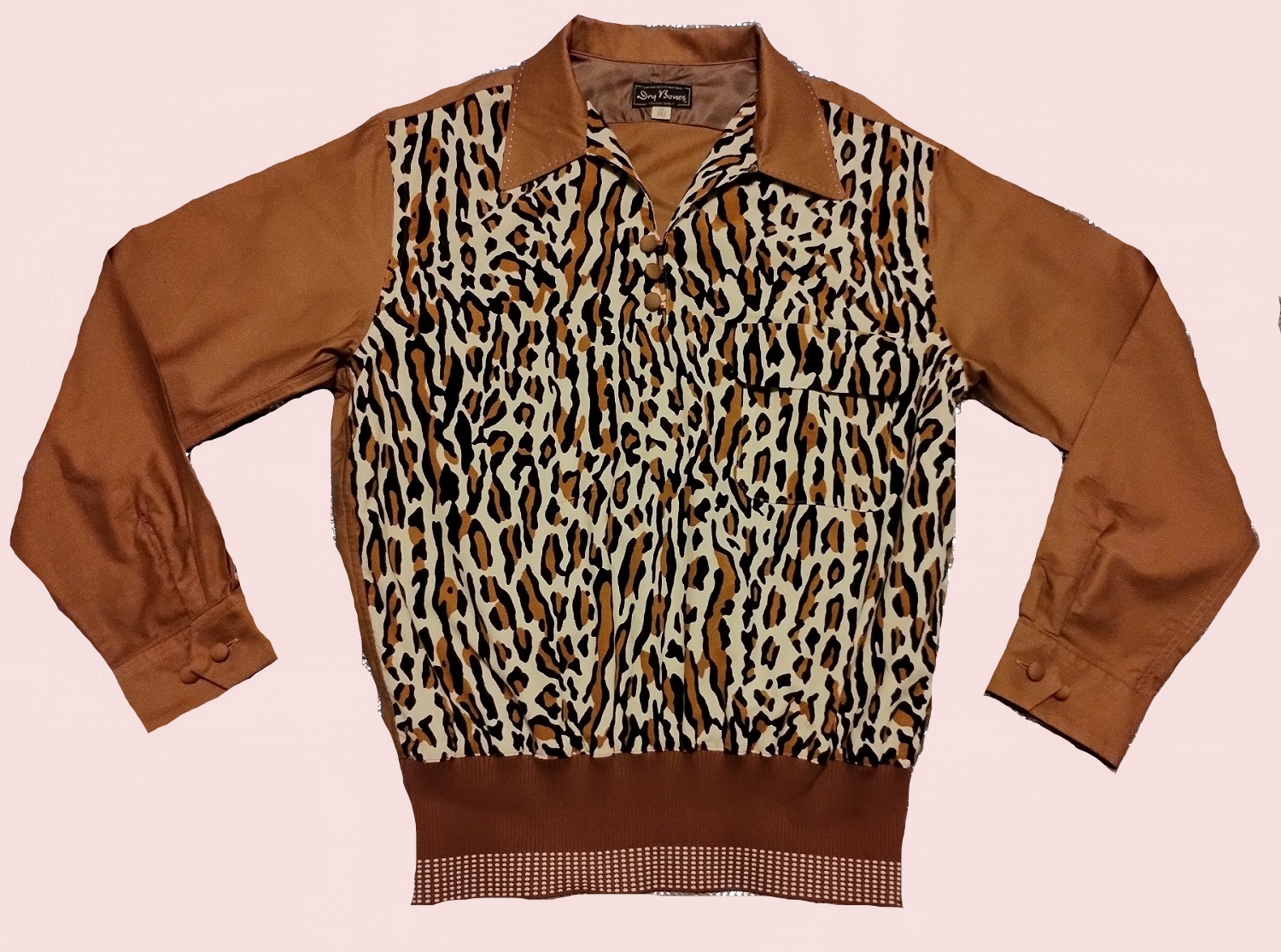 BEAUTIFUL shirt. Leopard panel is very, very fine corduroy. Sleeves and back are cotton.